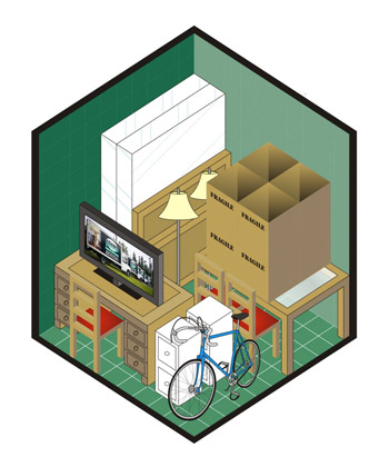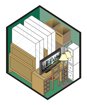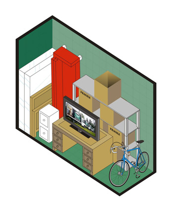 Enough space to store items from a two bedroom or studio apartment; mattress set, sofa, dining room set, 10 to 20 boxes and other miscellaneous items. This particular locker is often decided upon when customers are selling their house and preparing it for sale.